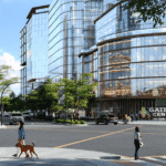 Dining and retail podium with serviced residences or hotel rooms above.